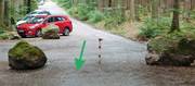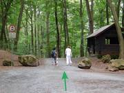 Dieser fest ausgebaute Waldweg endet an der "Schutzhütte am Grauen Stein", einem riesigen Steinhaufen (- den Sie aber vorerst noch nicht sehen können). Der dortige "Wendehammer" (da ist Parkverbot) ist unser Treffpunkt. Ausreichend viele Parkplätze gibt es wenige Meter vorher.