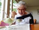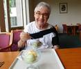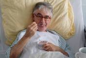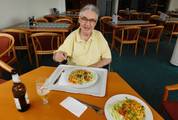 Und der Patient lächelt wieder. Es bleibt für mich nach wie vor ein "Rätsel", warum die Magensonde noch so lange "verblieben" war, obwohl sie seit mehreren Wochen gar nicht mehr benutzt, sondern nur noch (täglich mit Wasser) gereinigt wurde. Jedenfalls ist sie jetzt raus und es gab schon wieder ganz normales festes Essen mit Braten und Gemüse und Abends Käsebrot und sogar - wie man sieht - mehrere Quarkspeisen.