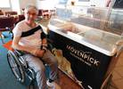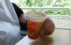 Besonders erwähnenswert ist, daß er mit der linken Hand und etwas Mühe den Jogurt Becher bereits umfassen kann - siehe Bilder. Auch das Eis als Belohnung zeigt enorme Wirkung. Mit dem DART Spiel mit den beiden Klett-Pfeilen konnte er jetzt selbst die noch vorhandenen Defizite bei seiner Motorik erkennen. Wir arbeiten dran.